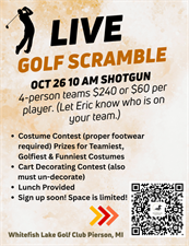 Please join us on October 26,2025 for our first ever "LIVE" Golf Event!  This is a 4-person, 9-hole scramble that will not be your usual outing.  There are (3) costume contest categories, a Cart Decorating Contest, drawings, prizes, White Elephant golf prizes and a great BBQ Lunch.  Get your "fits" and your team!  We will see you there!