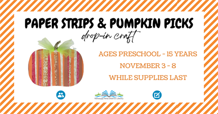 Drop in and get crafty! Kids aged preschool through 15 can create a fun fall decoration using colorful scrapbook paper scraps. They'll turn "scrappy strips" into a festive pumpkin—perfect for decorating or gifting. This easy craft is a great way to celebrate the season with creativity and a little mess-free fun!